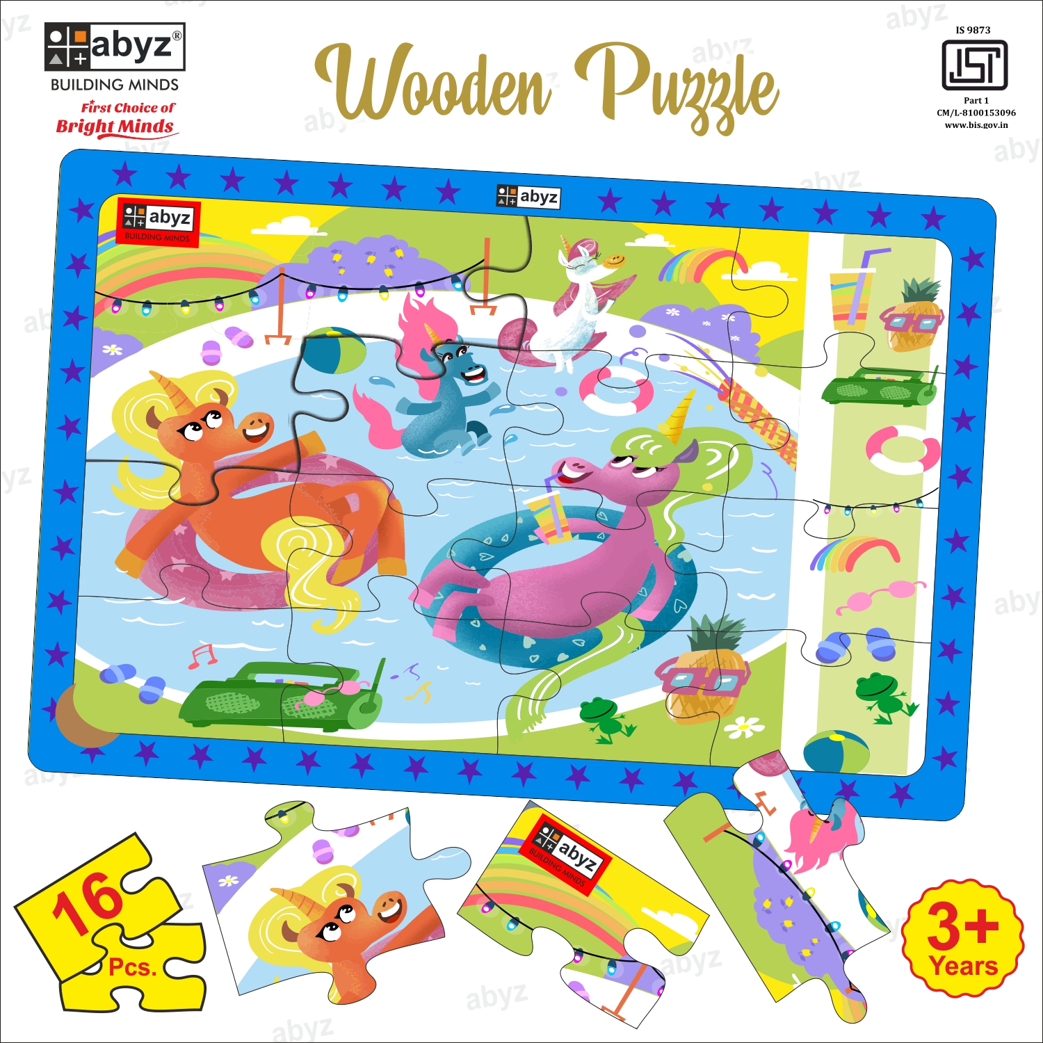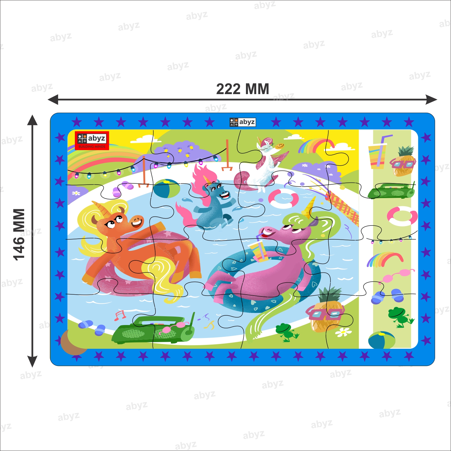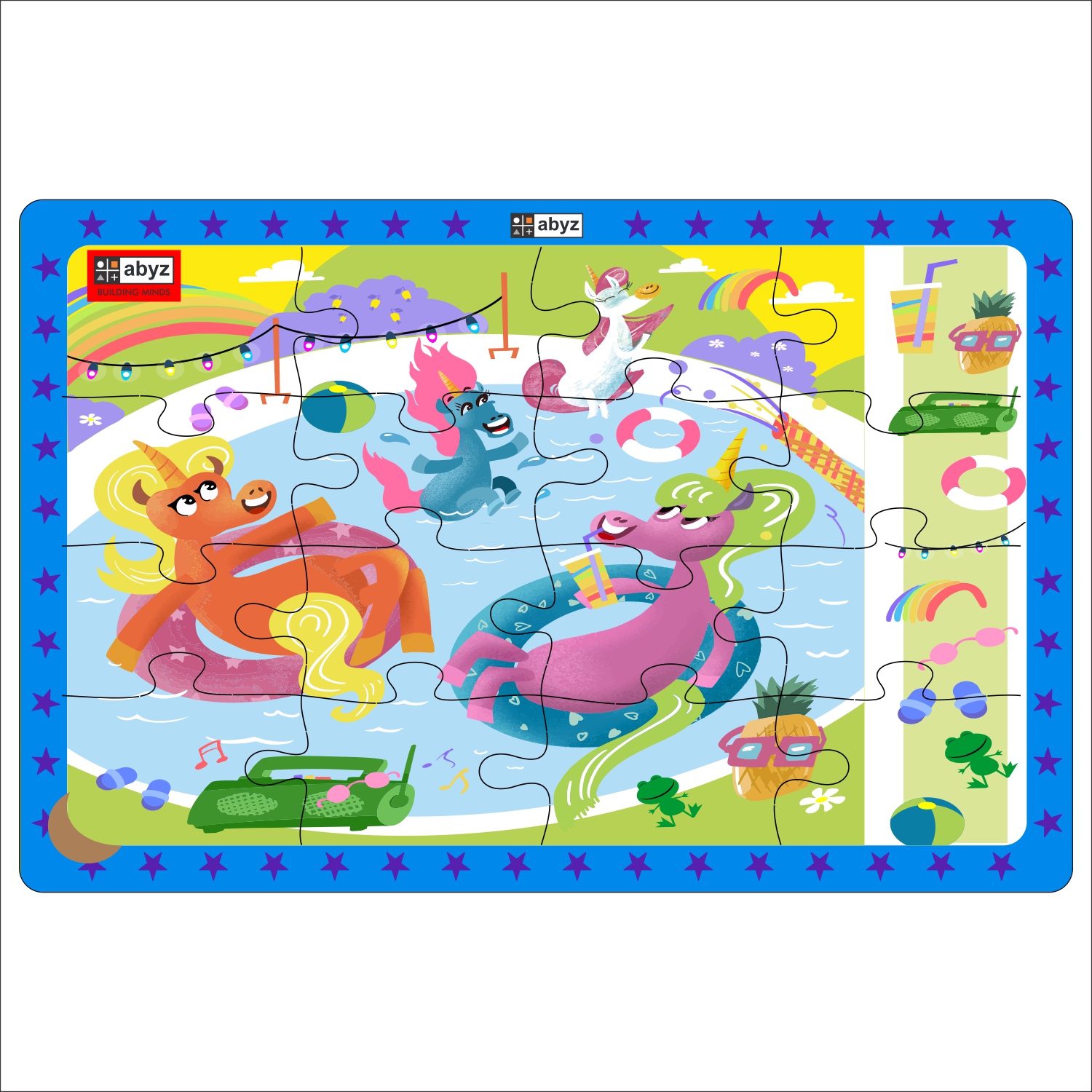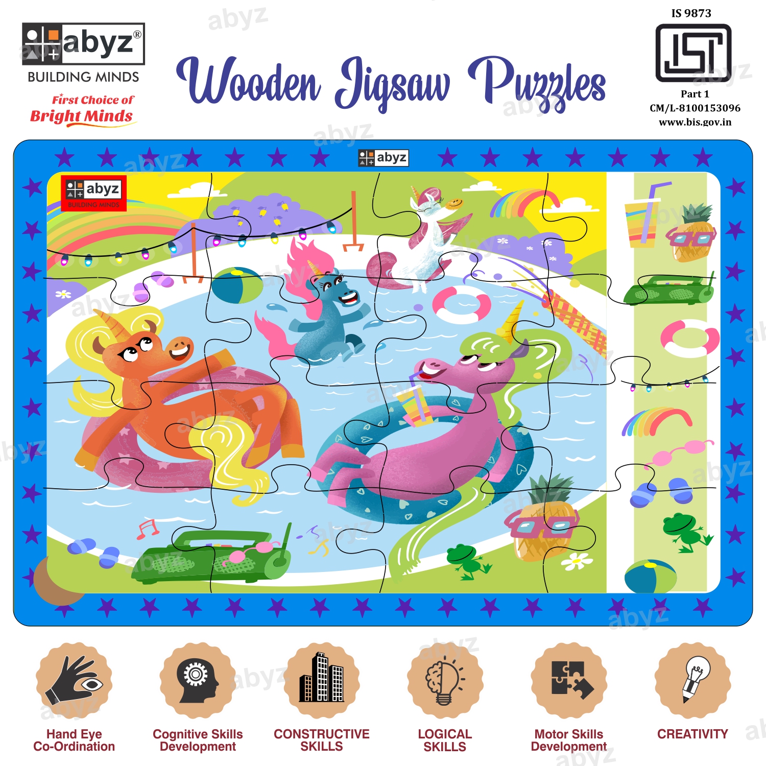 Introducing the ABYZ Unicorns Pool Time Jigsaw Puzzle, a Premium Wooden Puzzle with 16 PIECES with find the things