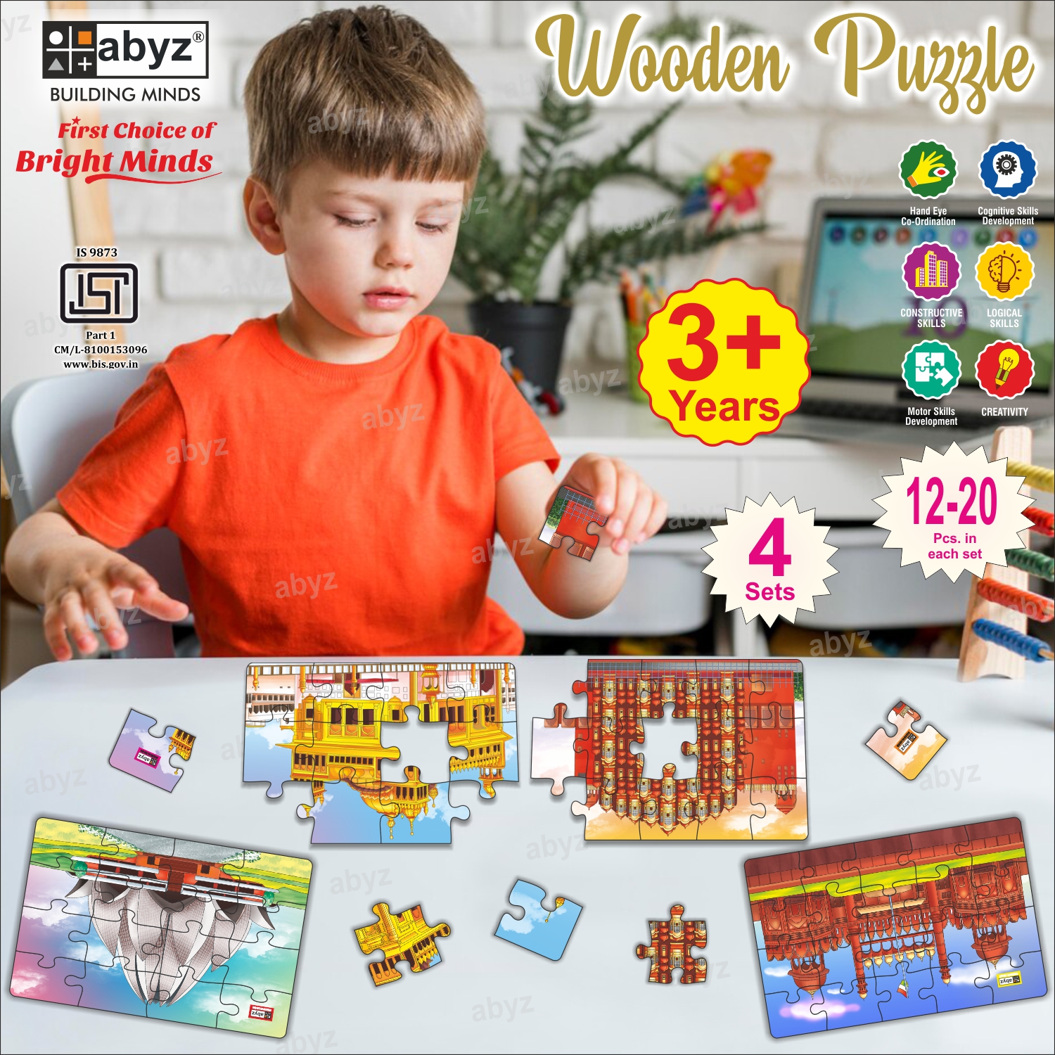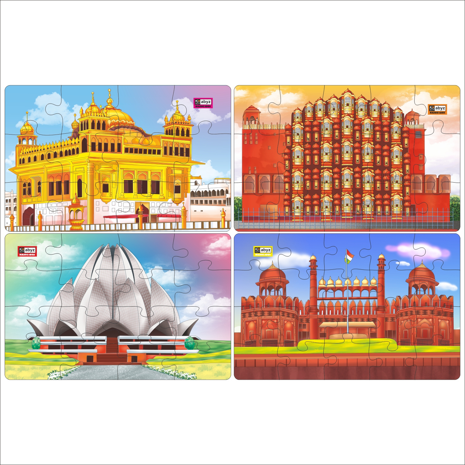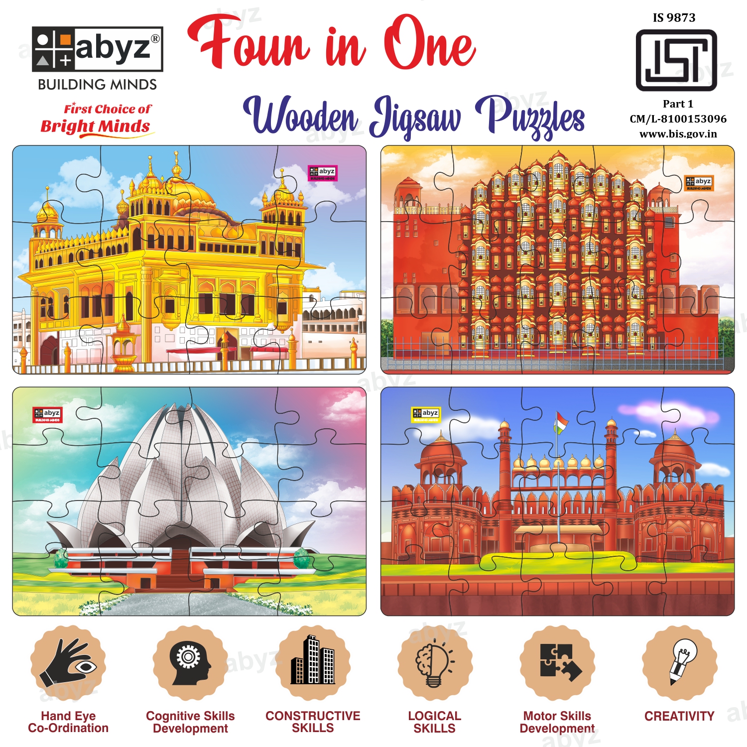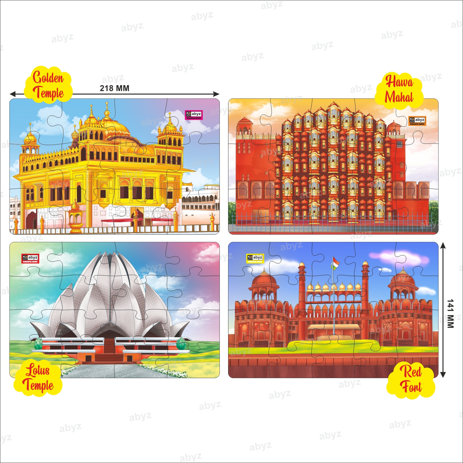 "Introducing the ABYZ ""4-in-1"" Golden Tample, Hawa Mahal, Lotus Temple, Red Fort Jigsaw Puzzle, a Premium Wooden Puzzle with 12, 15, 16 and 20 Pieces Respectively (Set of 4):
