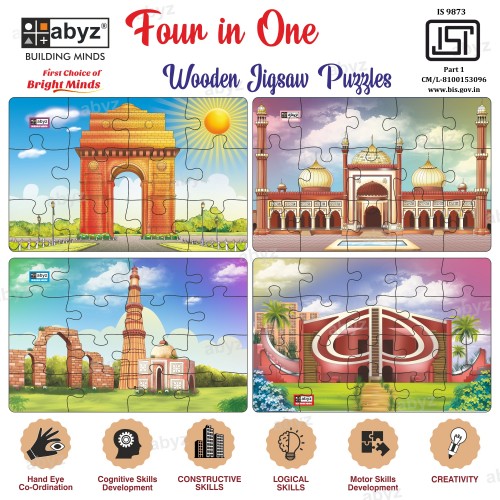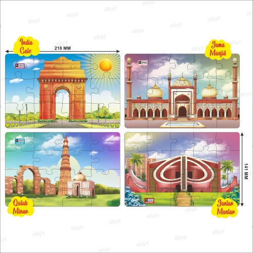 "Introducing the ABYZ ""4-in-1"" India Gate, Jama Masjid, Qutub Minar, Jantar Mantar Jigsaw Puzzle, a Premium Wooden Puzzle with 12, 15, 16 and 20 Pieces Respectively (Set of 4):