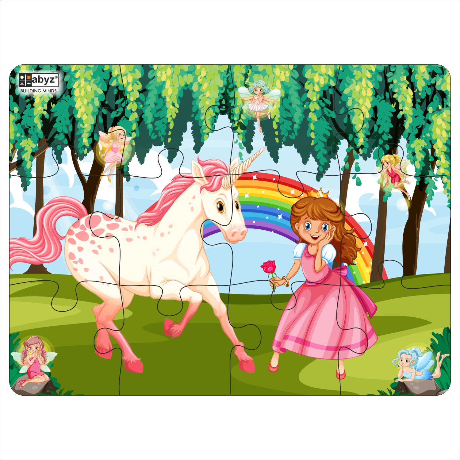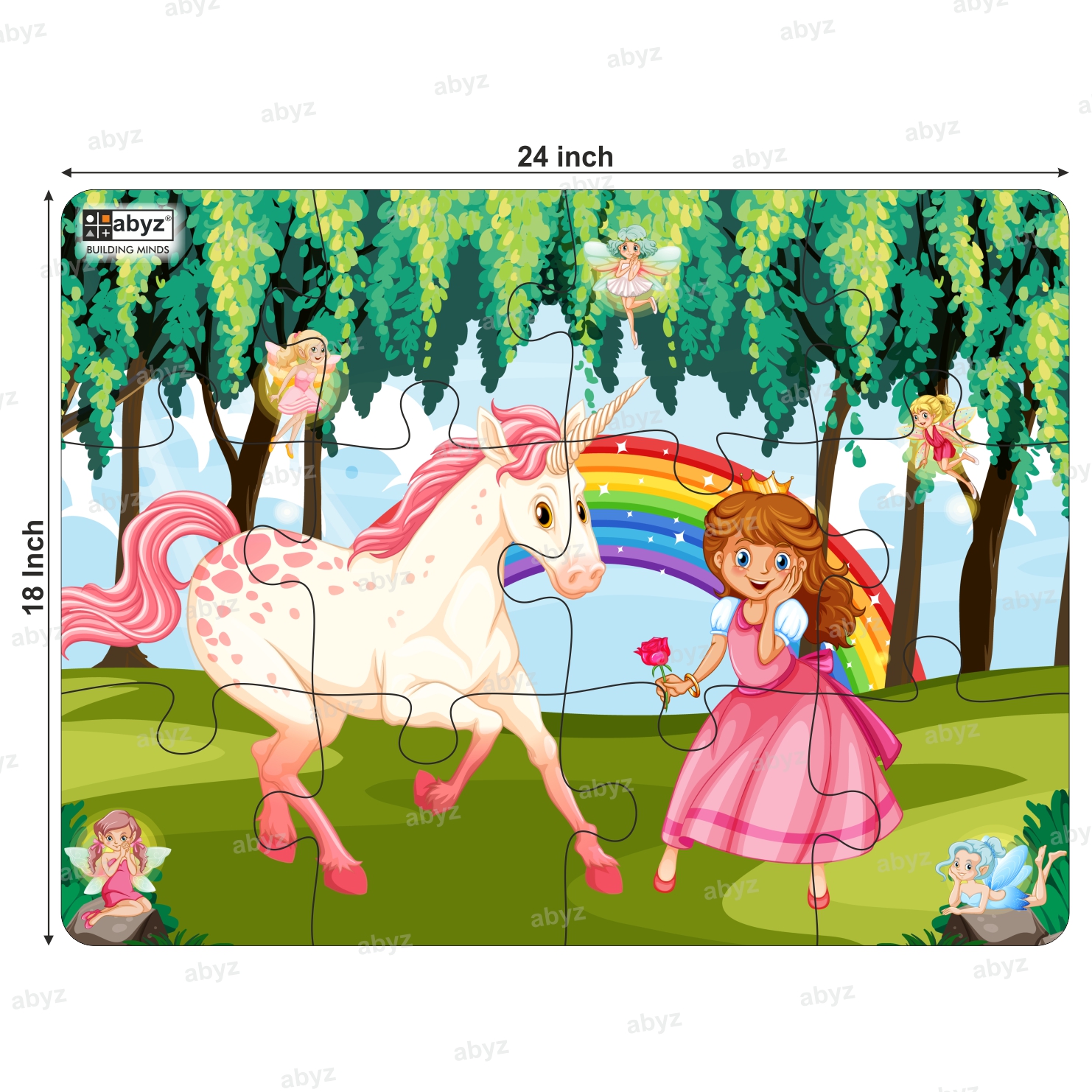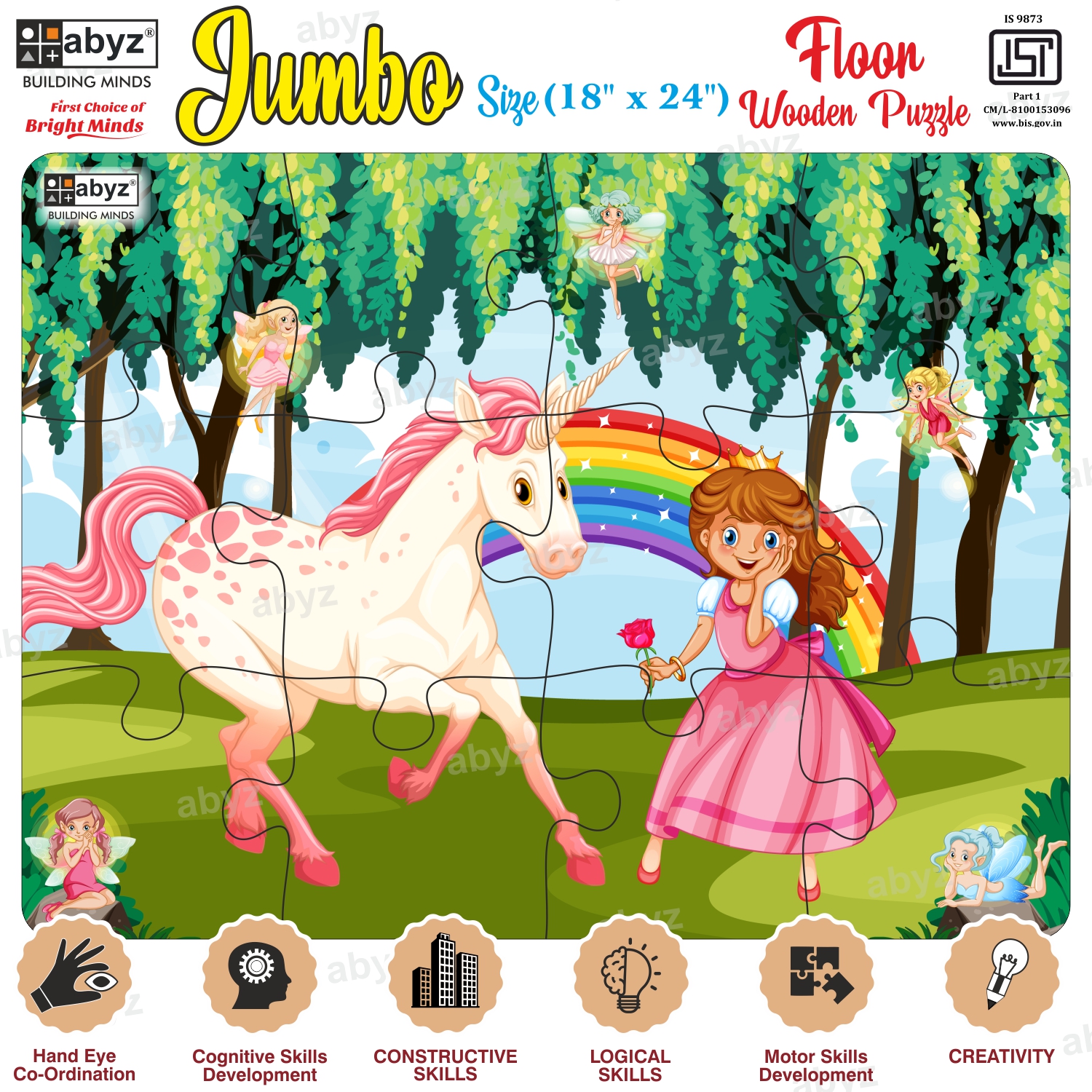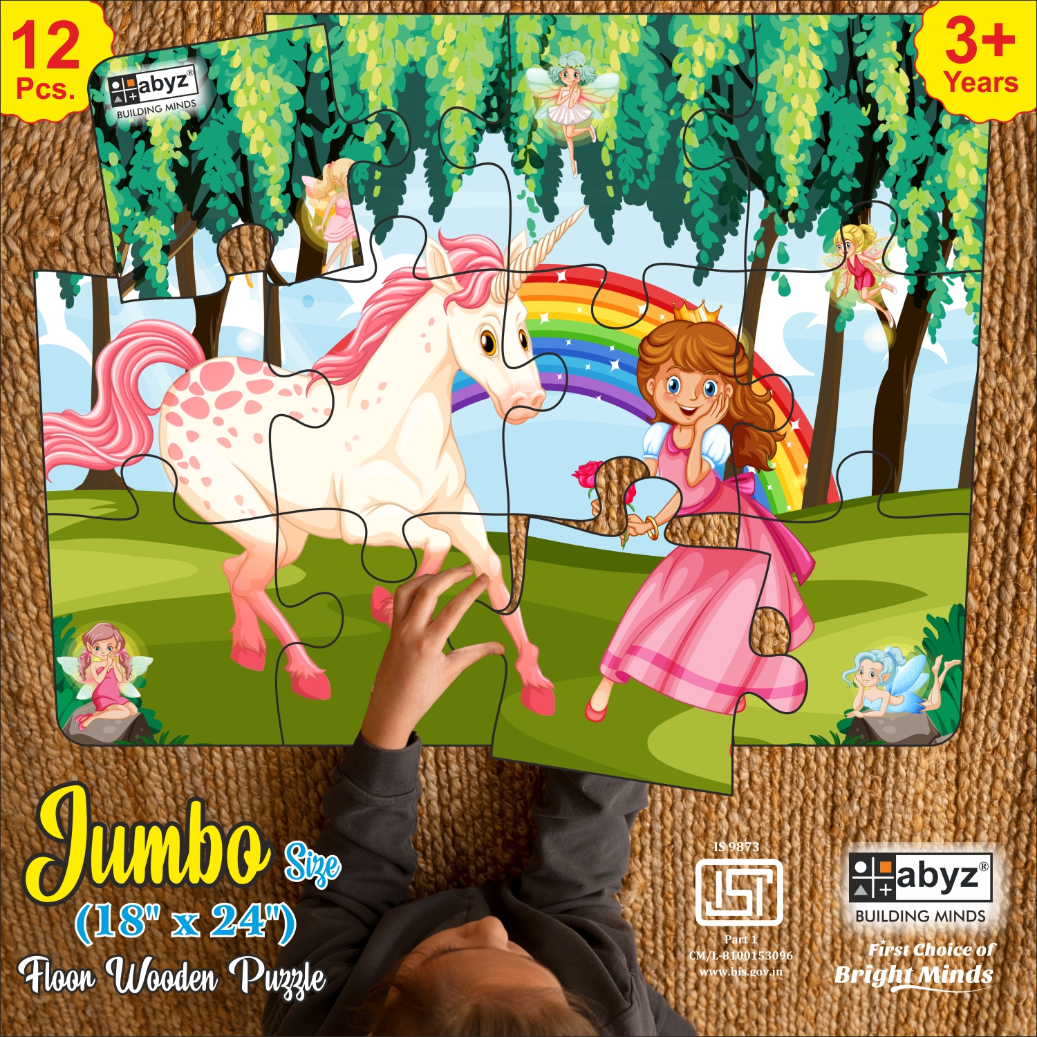 The ABYZ PRINCESS UNICORN wooden JUMBO floor puzzle measures 17.5 inches by 23.5 inches, providing a spacious and engaging puzzle-solving experience. Crafted from high-quality wood, the ABYZ puzzle ensures durability and longevity for repeated use. This ABYZ puzzle consists of 12 large pieces, making it suitable for young children. The ABYZ puzzle is ideal for developing problem-solving skills, hand-eye coordination, and spatial awareness in children.With its large, well-defined pieces, the ABYZ puzzle is easy for young children to handle and assemble without frustration. Featuring colorful and engaging illustrations, the ABYZ puzzle captures attention and stimulates imagination. Made from non-toxic materials and adhering to safety standards, the ABYZ puzzle ensures a safe and enjoyable play experience. Perfect for use at home, schools, daycare centers, or any educational or recreational setting, the ABYZ puzzle offers versatile entertainment. Designed for children ages 3 and up, the ABYZ puzzle provides entertainment and educational benefit. Backed by ABYZ's commitment to quality, customer satisfaction. The ABYZ puzzle is BIS approved, ensuring compliance with quality and safety standards set by the Bureau of Indian Standards.