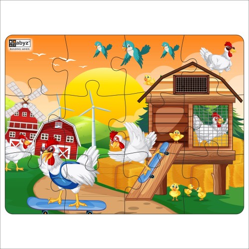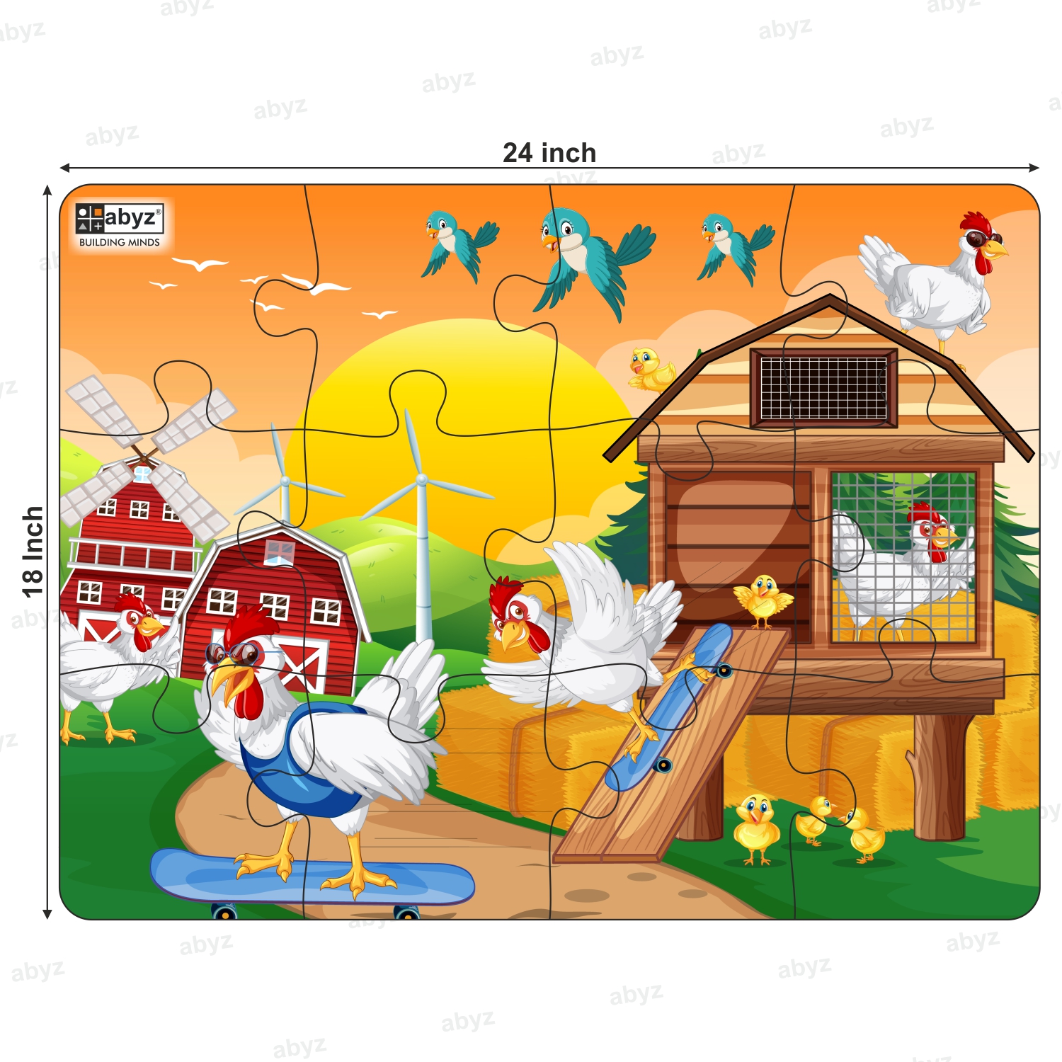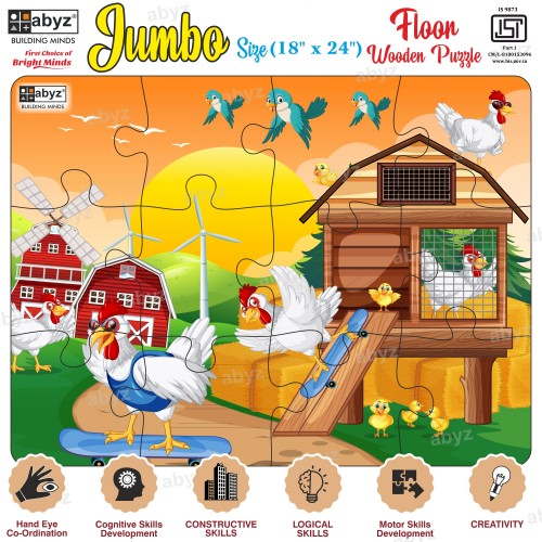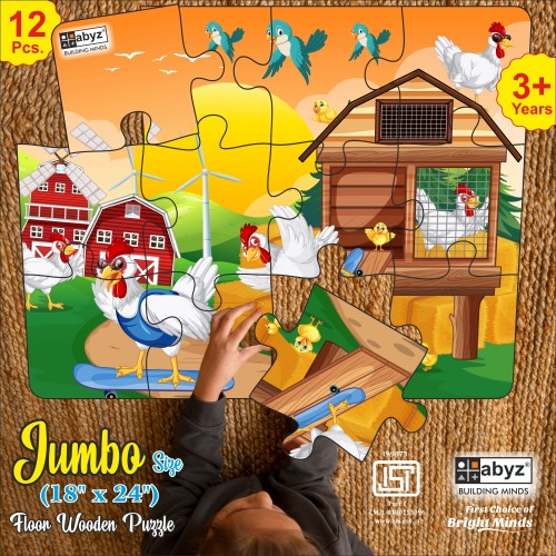 The ABYZ ROOSTER FARM wooden JUMBO floor puzzle measures 17.5 inches by 23.5 inches, providing a spacious and engaging puzzle-solving experience. Crafted from high-quality wood, the ABYZ puzzle ensures durability and longevity for repeated use. This ABYZ puzzle consists of 12 large pieces, making it suitable for young children. The ABYZ puzzle is ideal for developing problem-solving skills, hand-eye coordination, and spatial awareness in children. With its large, well-defined pieces, the ABYZ puzzle is easy for young children to handle and assemble without frustration. Featuring colorful and engaging illustrations, the ABYZ puzzle captures attention and stimulates imagination. Made from non-toxic materials and adhering to safety standards, the ABYZ puzzle ensures a safe and enjoyable play experience. Perfect for use at home, schools, daycare centers, or any educational or recreational setting, the ABYZ puzzle offers versatile entertainment. Designed for children ages 3 and up, the ABYZ puzzle provides entertainment and educational benefit. Backed by ABYZ's commitment to quality, customer satisfaction. The ABYZ puzzle is BIS approved, ensuring compliance with quality and safety standards set by the Bureau of Indian Standards.