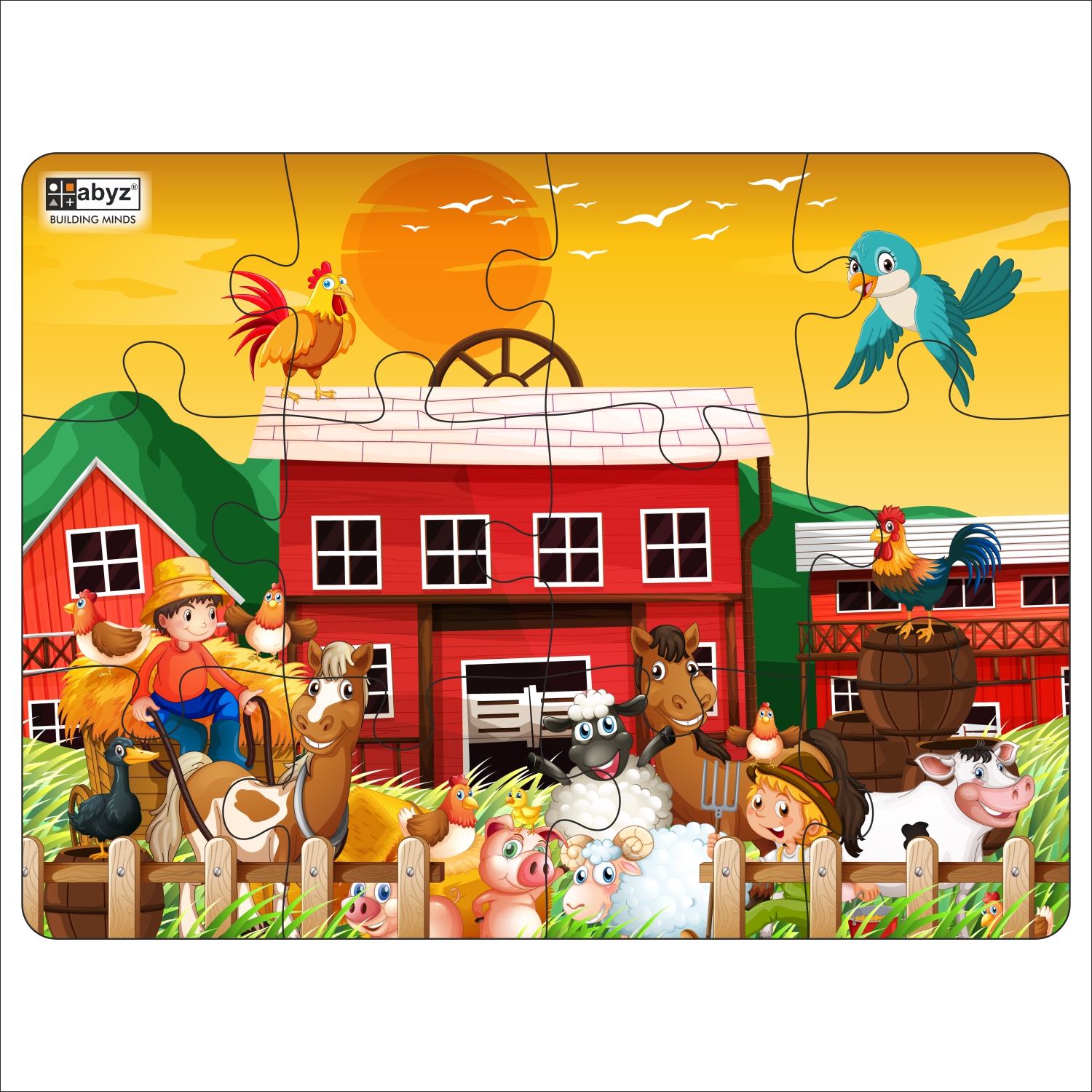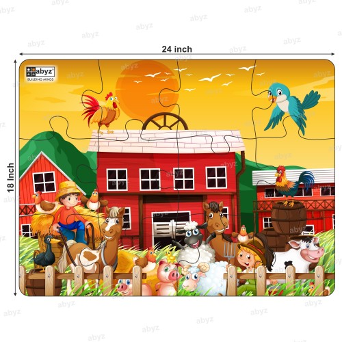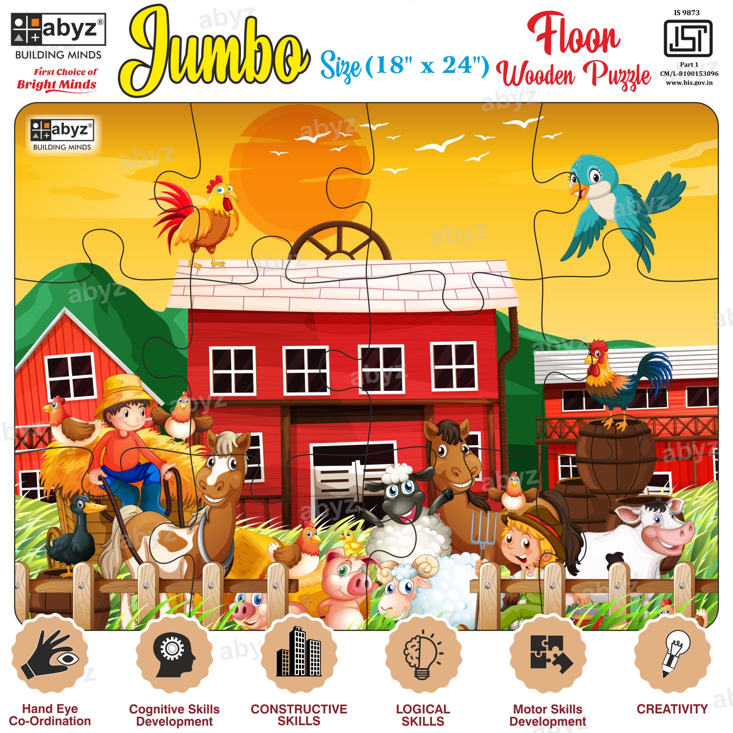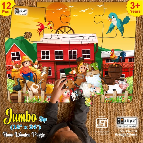 The ABYZ CATTLE FARM wooden JUMBO floor puzzle measures 17.5 inches by 23.5 inches, providing a spacious and engaging puzzle-solving experience. Crafted from high-quality wood, the ABYZ puzzle ensures durability and longevity for repeated use. This ABYZ puzzle consists of 12 large pieces, making it suitable for young children. The ABYZ puzzle is ideal for developing problem-solving skills, hand-eye coordination, and spatial awareness in children. With its large, well-defined pieces, the ABYZ puzzle is easy for young children to handle and assemble without frustration. Featuring colorful and engaging illustrations, the ABYZ puzzle captures attention and stimulates imagination. Made from non-toxic materials and adhering to safety standards, the ABYZ puzzle ensures a safe and enjoyable play experience. Perfect for use at home, schools, daycare centers, or any educational or recreational setting, the ABYZ puzzle offers versatile entertainment. Designed for children ages 3 and up, the ABYZ puzzle provides entertainment and educational benefit. Backed by ABYZ's commitment to quality, customer satisfaction. The ABYZ puzzle is BIS approved, ensuring compliance with quality and safety standards set by the Bureau of Indian Standards.